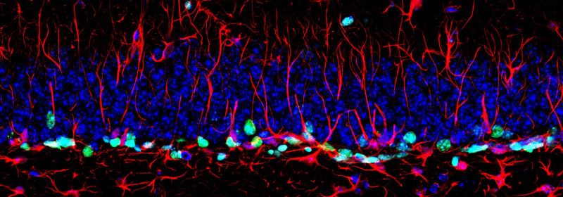Microscope image of the memory centre of the adult brain, highlighting dormant stem cells with red radial fibres. Dividing cells are in green. (Credit: Francis Crick Institute)
